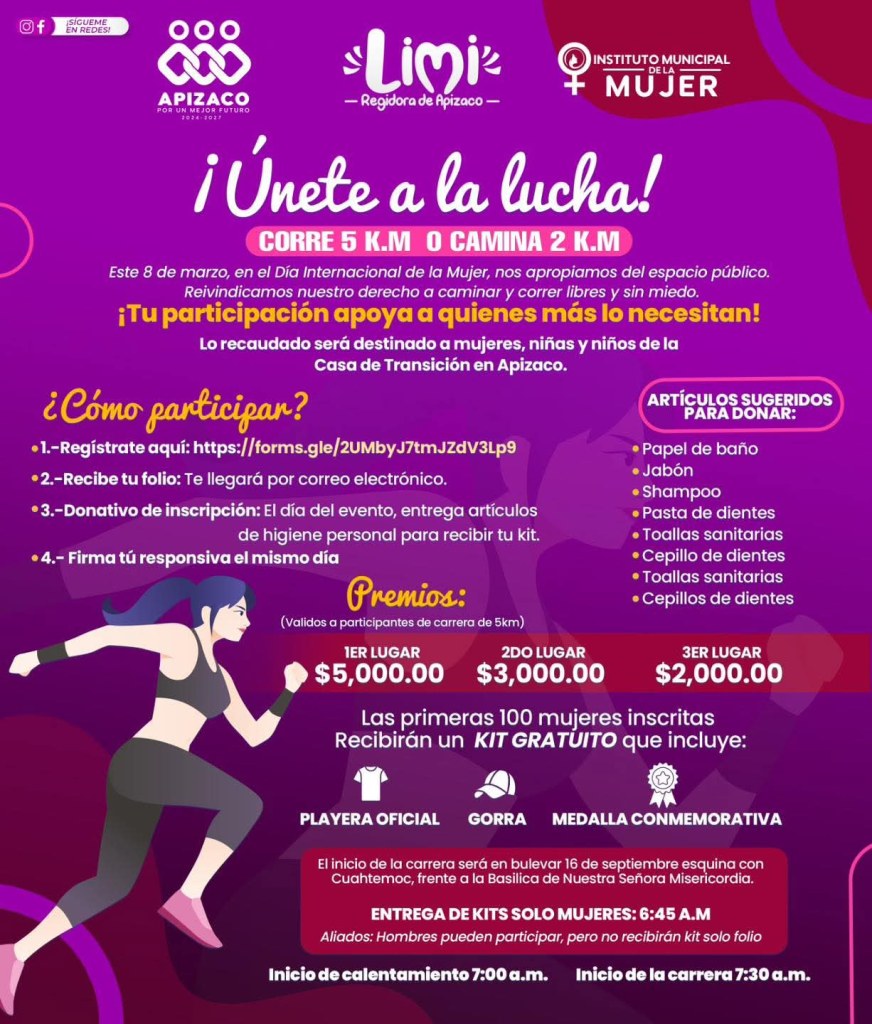 En el marco del Día Internacional de la Mujer, el Gobierno Municipal de Apizaco invita a participar en la carrera con causa “¡Únete a la lucha!”, donde podrás correr 5 km o caminar 2 km y, al mismo tiempo, apoyar a mujeres, niñas y niños de la Casa de Transición.